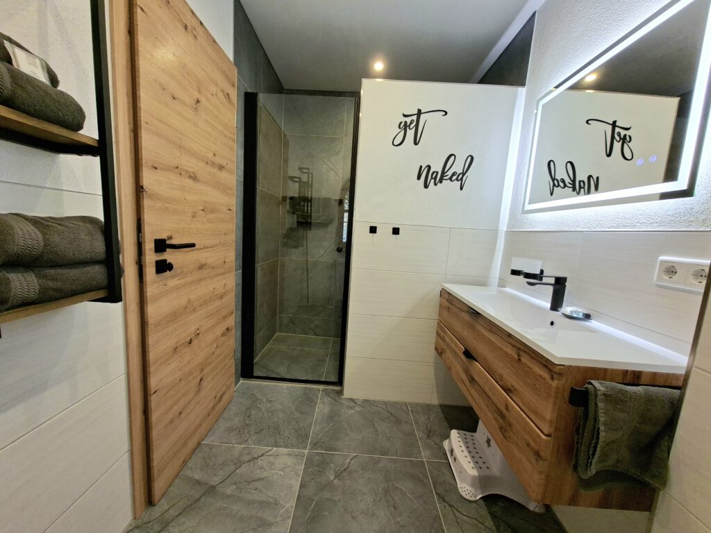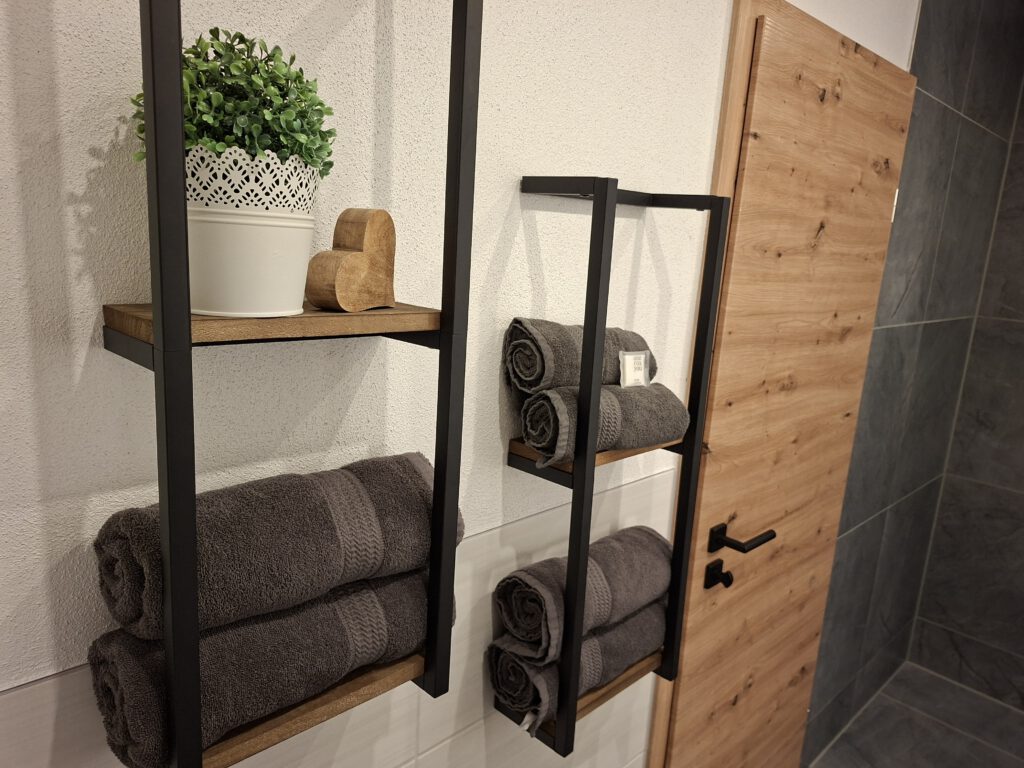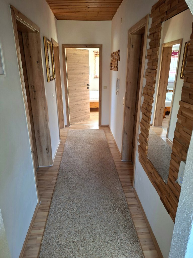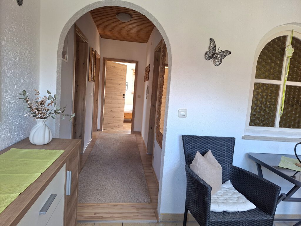 Unsere Ferienwohnung III befindet sich im 1. Stock unseres Hauses und umfasst 60 m² Wohnfläche. Die Wohnung ist ausgestattet mit 2 getrennten Schlafzimmern mit jeweils einem Doppelbett. Ein modernes, im Winter 2026 neu renoviertes Badezimmer mit Dusche und WC, sowie einem Wohnraum mit Couch, Essecke und einer großzügigen Küchenzeile. Zusätzlich hat die Wohnung einen kleinen, überdachten Balkon zur Südostseite.